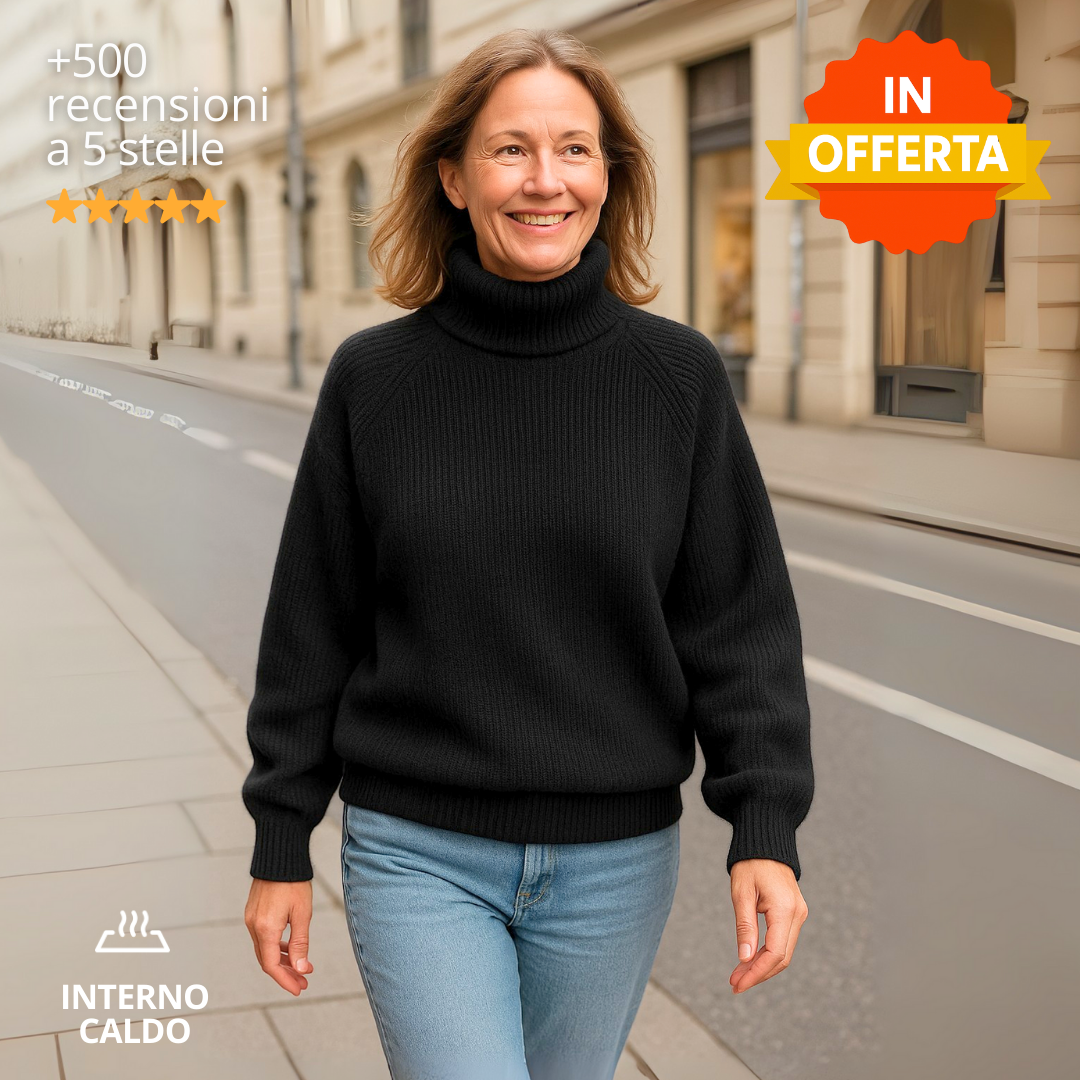 Vivo in montagna: con questo maglione esco senza giacca leggera fino a 8-10°. Interno morbidissimo, non pizzica.